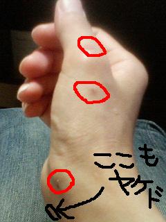 右手の3箇所(赤マル部分)と、左手の二の腕まで。
