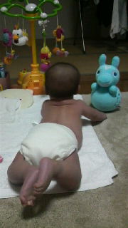 だいぶ首も座り、最近は寝返り練習に励んでおります。
