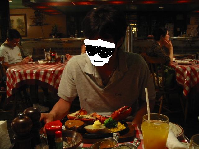 ロブスターを前に、これなら完食できそうと満足そうな夫と、