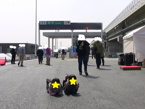 料金所をバックに、なぜか寝転ぶ二人(= =;)