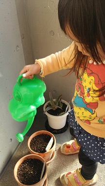 新芽がお水をあげたのを見て、『私も~』と若芽。